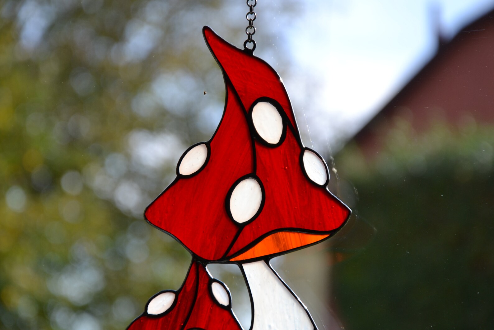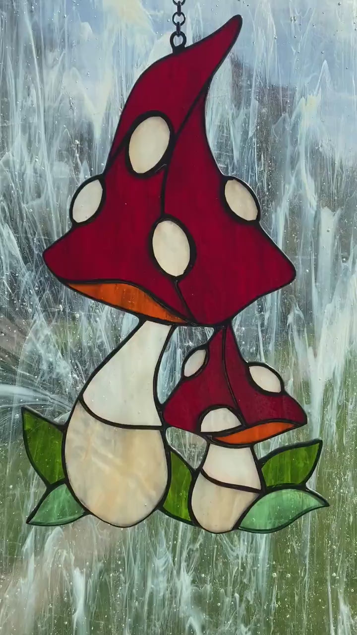 Mushrooms window hanging suncatcher made of stained glass pieces by my own disign.