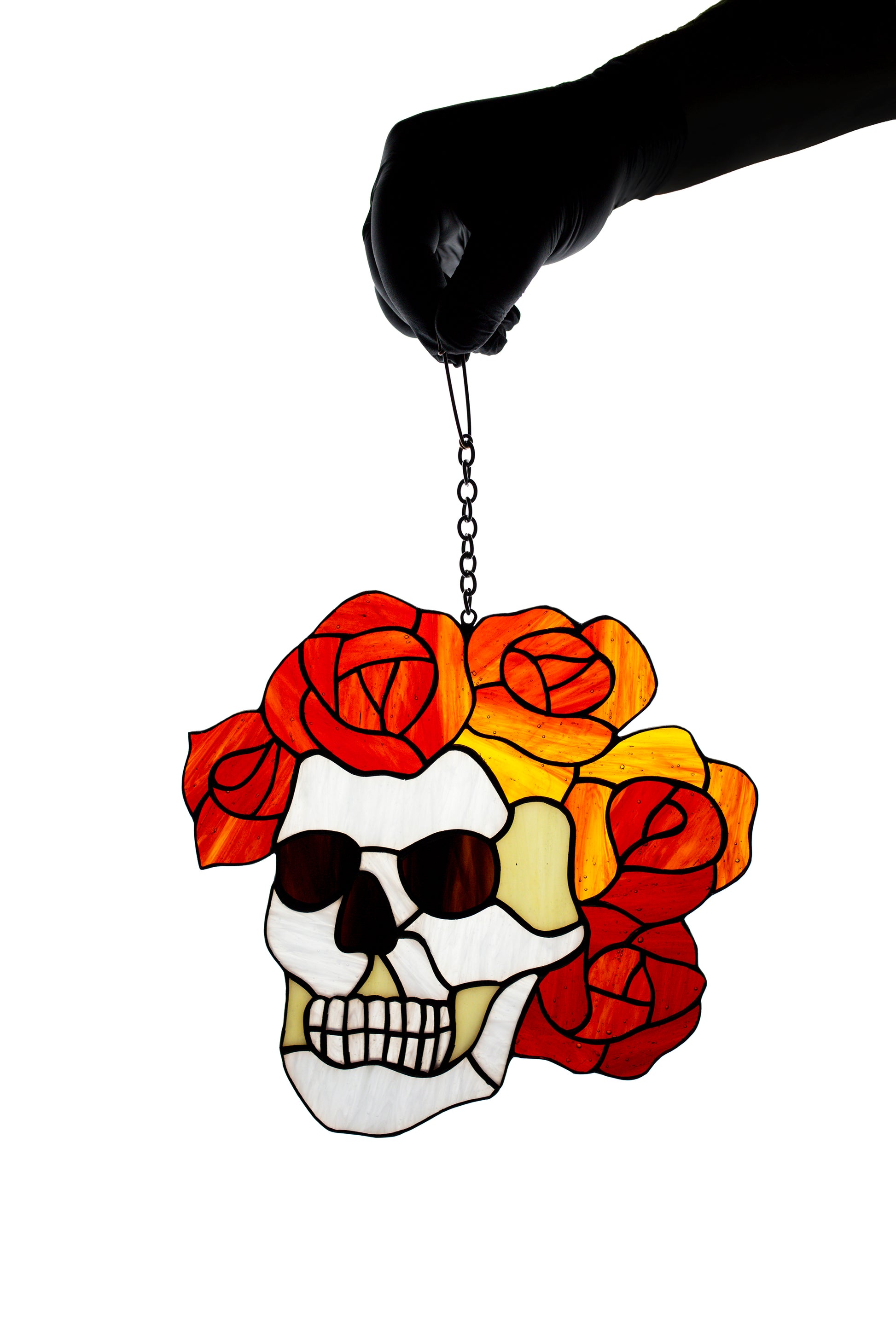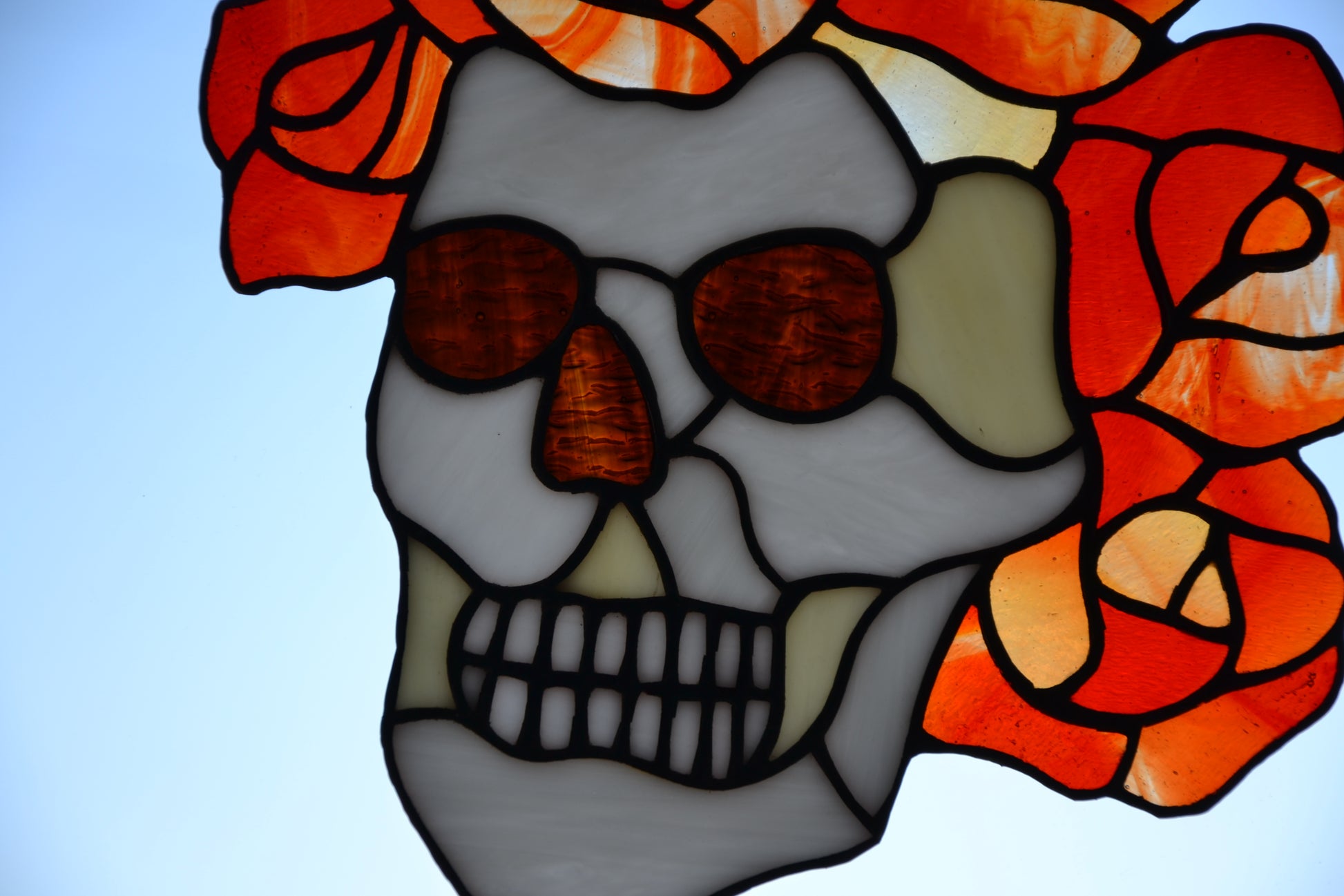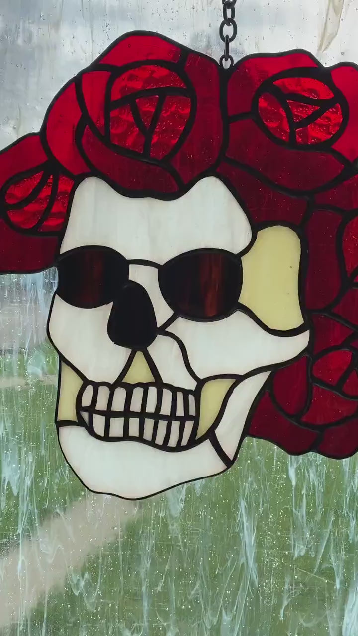 Stained glass suncatcher Grateful Dead Berta Skull and roses Music logo Glass art Santa muerte Glass calavera Gift for a man Stain glass