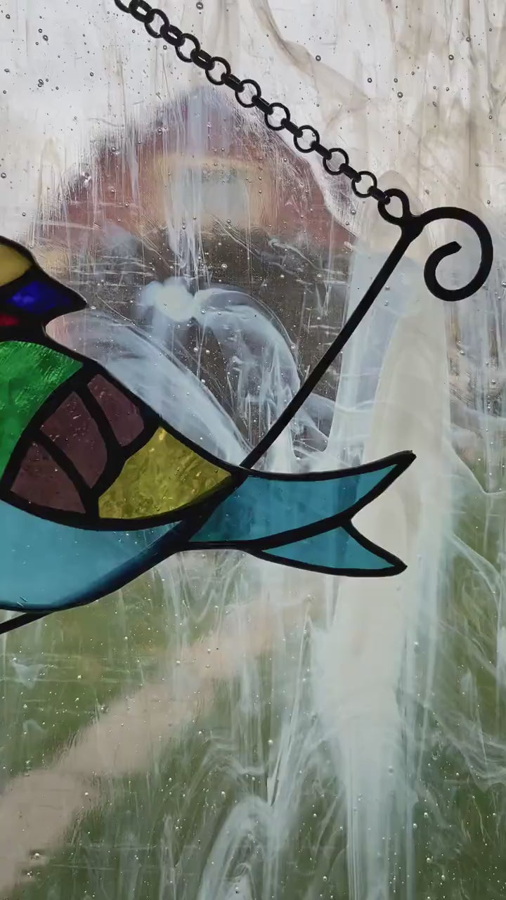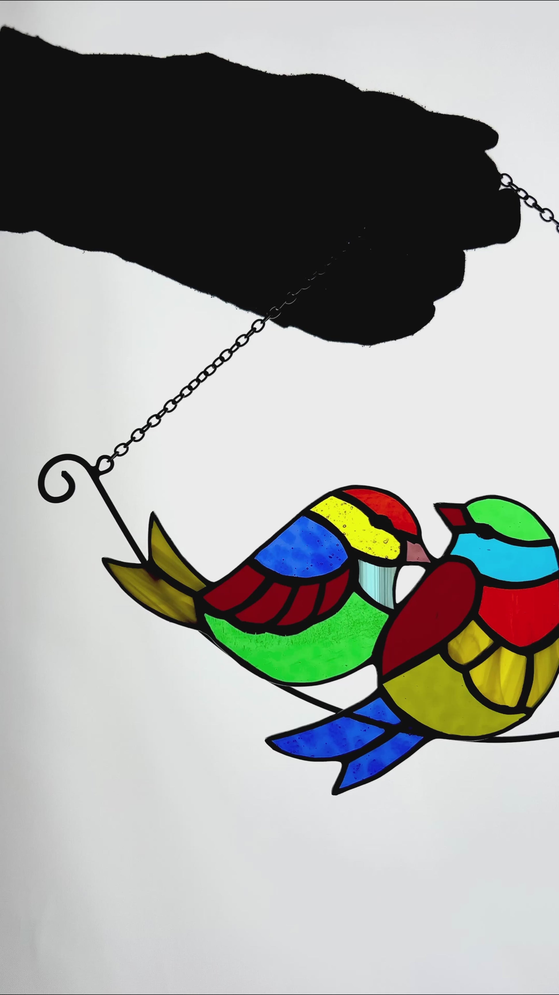 Elevate your home decor with our exquisite birds on a branch stained glass suncatcher. Crafted with meticulous artistry, this stunning suncatcher depicts a serene scene of birds perched on a delicate branch, their vibrant plumage and intricate details beautifully captured in stained glass. When sunlight pours through, the suncatcher transforms into a breathtaking display of colors, casting a warm and inviting glow in any space. Hang it in your window, garden, or any sunlit area to create a captivating focal point that will bring nature's tranquility indoors. Our Birds on a Branch Stained Glass Suncatcher is not only a visual delight but also a symbol of freedom, harmony, and the beauty of the natural world. Add a touch of elegance and whimsy to your home with this enchanting suncatcher, a true testament to the timeless allure of stained glass art.